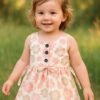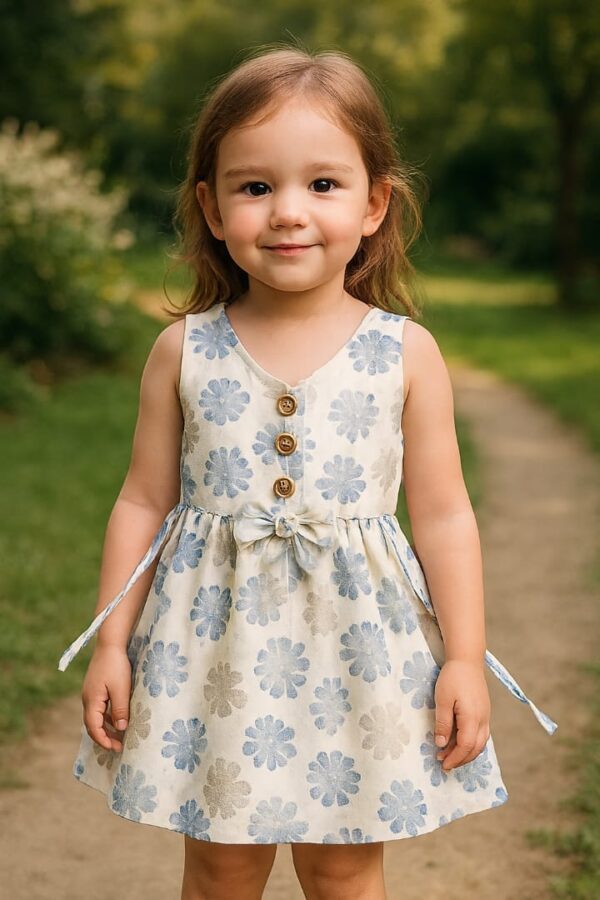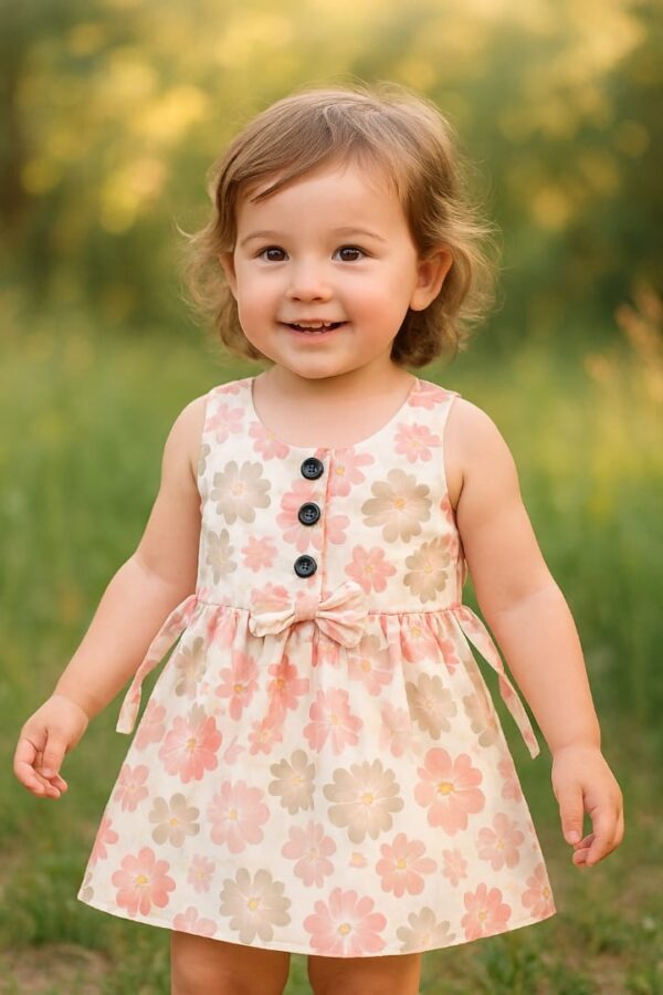 Dress your little princess in the sweet elegance of the Blush Blossom Sleeveless Floral Frock by Riddhima Fashion. Crafted from lightweight and breathable fabric, this frock features a pastel floral print in soft shades of blush pink and beige, enhanced with front buttons and a dainty bow at the waist. The sleeveless design ensures comfort and ease, making it a delightful choice for warm days.