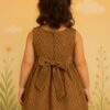 Crafted with soft breathable cotton blend, this frock features an eye-catching brown chevron pattern and a beautiful oversized bow at the waist with a golden embellishment for extra charm. The sleeveless cut keeps it comfortable for warm days while the flared pleated skirt adds a playful twirl effect.