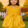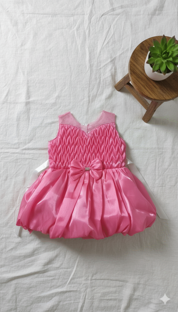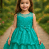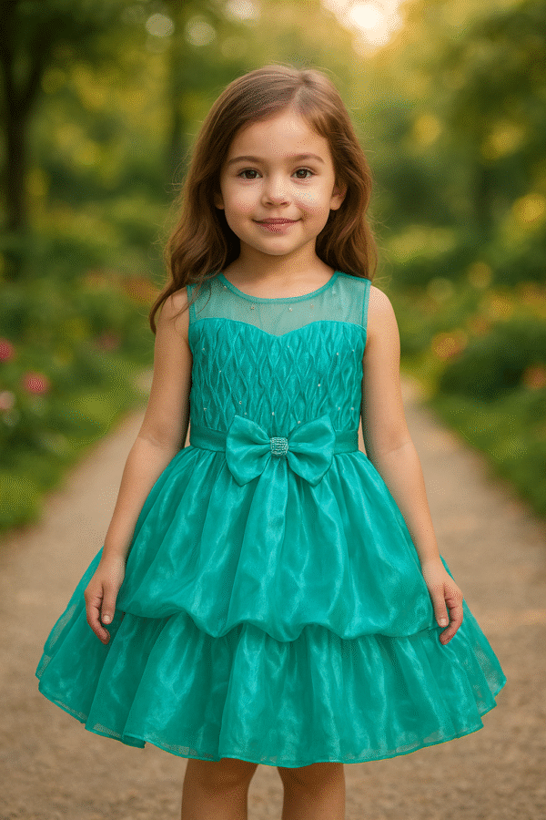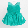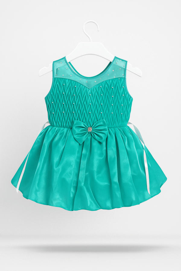 Let your little princess shine in this Aqua Sparkle Net Party Frock, designed to bring elegance and joy to every special moment. Crafted from premium satin and net fabric, the dress features a beautifully pleated bodice with delicate pearl embellishments and a shimmering layered skirt for a royal look. The satin bow with a crystal centerpiece adds a touch of glamour, while the soft inner lining ensures comfort for long wear. Ideal for birthdays, weddings, festive celebrations, or photo shoots — this frock makes your child stand out in style.