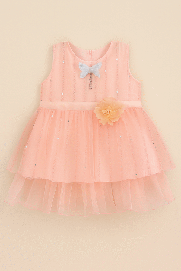 Introduce glamour and charm with our Delicate Peach Sequined Tulle Frock. Designed to make your child shine, this dress features soft, shimmering fabric and delightful embellishments, making it an ideal choice for any party or family event.