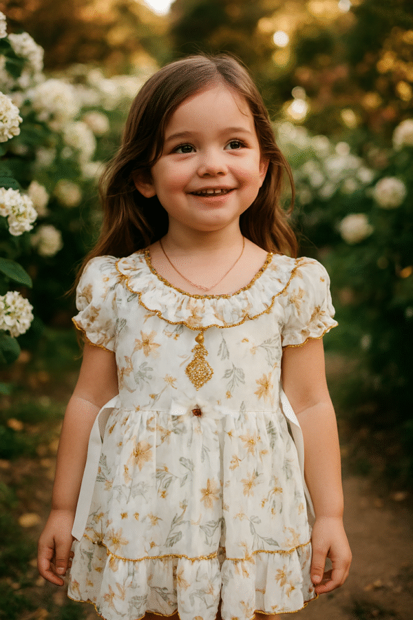 Step into a world of elegance and charm with our Floral Garden Premium Chiffon Frock. This beautifully designed dress captures the essence of a serene garden with its delicate green and white floral print, making it a timeless addition to your child’s wardrobe. Every detail is crafted to make your little girl feel special and comfortable.