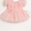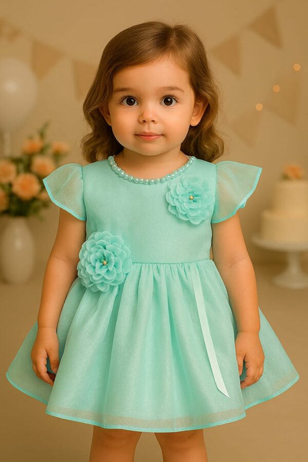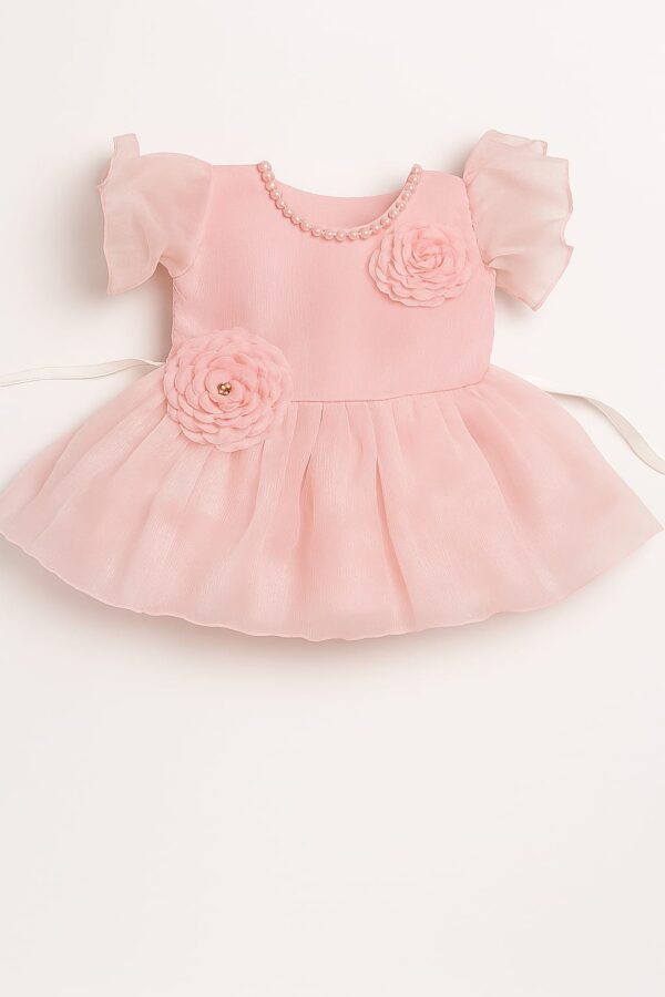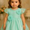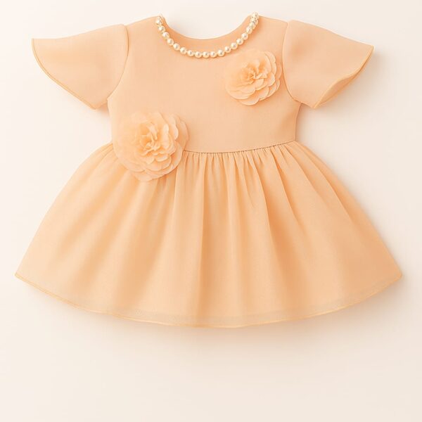 The dress is adorned with two 3D floral appliqués at the bodice and waist, while the neckline is embellished with a subtle pearl design, adding charm and grace. Its soft, lightweight fabric ensures all-day comfort without compromising style.
