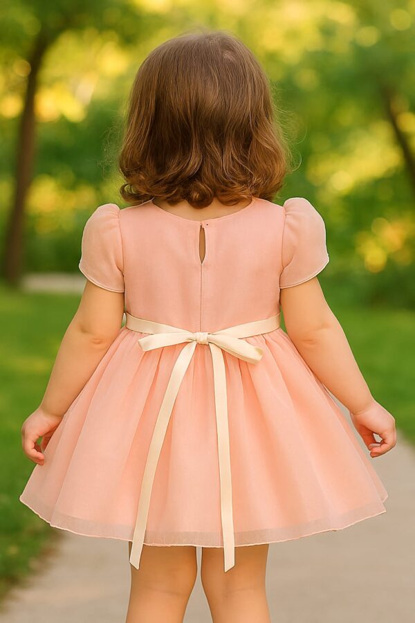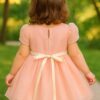 Dress your little princess in timeless elegance with the Peach Blossom Party Frock. This beautiful frock is crafted in a soft peach shade with delicate puff sleeves and a flared skirt, creating a fairy-tale look for your baby girl.