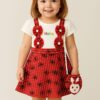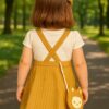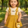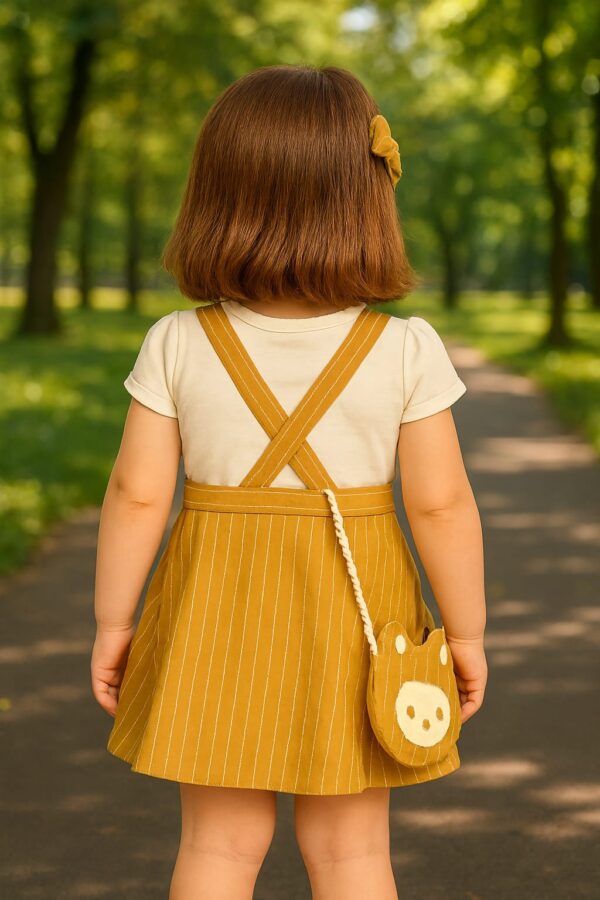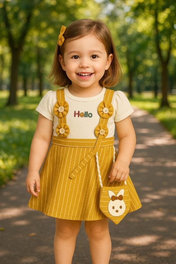 Let your little angel shine in the Sunny Bloom Suspender Frock Set by Riddhima Fashion. This stylish two-piece outfit comes with a soft white t-shirt and a golden-yellow suspender frock featuring vertical stripes and floral button accents. The outfit is completed with an adorable bunny-shaped sling bag, making it playful yet fashionable. Crafted from soft, breathable fabric, this frock set ensures all-day comfort while keeping your child trendy.